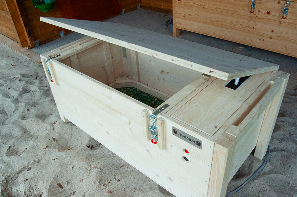 • Optionale Schutzkiste aus Holz für die Elektrik: Ideal, wenn die Elektrik dauerhaft an der Box verbleiben soll – sauber, sicher und geschützt